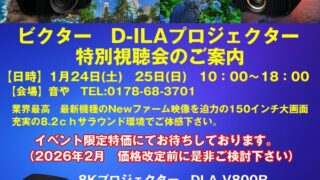 あけましておめでとうございます。 今年も宜しくお願い致します。 1月24(土)25(日) ビクター D-ILAプロジェクターの 視聴会を開催いたします。 日時:1月24(土)25(日) 10:00~18:00 場所:音や […]
